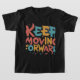 A dynamic and inspiring t-shirt design featuring the phrase "Keep Moving Forward" in a bold, graffiti-style font. The text is adorned with a vibrant colour palette and surrounded by energetic, abstract shapes that capture the spirit of progress and determination. The design is visually striking and motivational, perfect for those who seek inspiration and encouragement to overcome challenges and strive towards their goals.