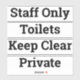 Collection of Four Door Signs. Staff Only; Toilets; Keep Clear; & Private. Colour black. Change wording to suit your needs.