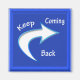 Magnet with Keep Coming Back written on velvety blue colour background and arrow pointing as if.to point the way to coming back..