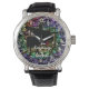 Keeping Time Drummer and Music Notes Watch. A drummer plays a drum set over psychedelic rainbow musical notes with light metallic gold numbers and the words "keeping time". A Music Watch for your favourite percussionist musician or music lover.