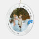 Modern Christmas Holiday keepsake ornament with round photo, snowflakes, blue mittens and modern font.