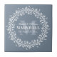 Floral Wreath Calligraphy Typography Monogram Ceramic Tile in Dusty Blue and White - Stylish blue and white monogrammed ceramic tile gift for newly wed a couple that features a custom monogram, groom & bride names, last name, and wedding date templates surrounded by a bold floral line art wreath. A thoughtful keepsake gift for a couple's housewarming party or wedding present. ©sweetwhimsypaperie