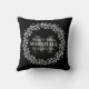 Floral Wreath Calligraphy Typography Monogram Throw Pillow in Black and White - Stylish black and white monogrammed throw pillow gift for a newly wed couple that features a custom monogram, groom & bride names, last name, and wedding date templates surrounded by a bold floral line art wreath. A thoughtful keepsake gift for a couple's housewarming party or wedding present. ©sweetwhimsypaperie