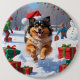 Keeshond Dog Running in Snow with Christmas Hat 6 Cm Round Badge