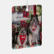 Two keeshond pose in a holiday truck scene/