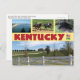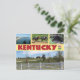 Celebrating the state of Kentucky in the USA with multiview photos of Lake Cumberland, horse racing, Mammoth Cave entrance, and a farm with white wood fence. The name Kentucky is in the middle with USA and a small American flag icon.