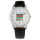 The Flag of Kenya shows on this personalised men's watch with the word KENYA below, in the colours of the flag. Above is a place for a name in green letters. Personalise for your own use or for a gift. The flag has a Maasai Shield in the centre with colours on flag of red, white, and black. Fun wrist watch to wear to a family reunion.