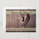 Save the date postcard with metal heart-shaped lock on rustic wooden door.