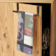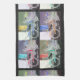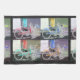 The colourful design on this Kitchen Towel was made from an original photograph by ZoeSPEAK of a bicycle parked outside a shop in Key West, Florida. Clothing from the shop hangs on the open door behind the bicycle. The photo is done in four colour schemes, red bike, blue bike, green bike and yellow bike, with corresponding clothing colours. The backgrounds are in muted shades of mauve and olive greys, and the overall background is a marbled black.