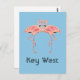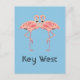 Key West Florida art deco lettering pink flamingo couple posed on one leg retro postcard with blue background.