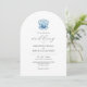 A crisp white background showcases refined typography, combining classic calligraphy with a clean sans-serif font for a modern yet timeless look. A soft watercolor crest in ocean blue frames your initials, adding a personalised touch of elegance.