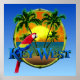 Key West beach sunset painting with palm trees, round bamboo frame, and a colourful parrot.