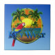 Key West Florida, the southernmost city in the United States. beach sunset painting with palm trees, round bamboo frame, and a colourful parrot over ocean blue water.