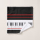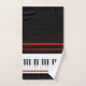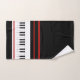 This whimsical bath towel set is perfect for pianist and musicians. The set features a piano keyboard wrapped around a white background, black and red accent. stripes. Keyboard Serenade also has a matching bath mat, a bath set and shower curtain. The set consists of a wash cloth, hand towel and bath towel. Pieces can be purchased individually or as a set.
