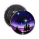 This enchanting digital artwork encapsulates the vast starry sky within a perfect circular world. The piece is dominated by deep blue and purple gradients, creating a tranquil and mysterious night. Several radiant starbursts glitter in the firmament as if lit by magic. Below, silhouetted pine trees and a purple horizon evoke the dreamy atmosphere of a cold winter or the far North. This design is imbued with a sense of fantasy, romance, and festivity, making it ideal for conveying well wishes, enhancing decor, or serving as a unique gift design. Its circular composition and distinct landscape bring a unique and captivating visual effect to any product.