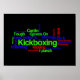 This custom black poster features a text design called a word cloud. The main subject is Kickboxing and the other words support why kickboxing is so awesome! The text colours are so vibrant they are fluorescent; green, blue, and red on a black background. Choose your size and paper type. This word cloud was made with my words using wordle.net.