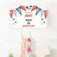 Kid's birthday party banner. 6th birthday. Kickin it at six. Soccer. Red, blue, black and white.