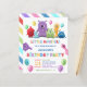 A little monsters kid and children's Birthday Party Invitation. On a white background, multi-colored monsters in red, pink, blue, purple, green and yellow, are seen holding party balloons. The typography text reads little monsters, let's make mischief at Your child's name Birthday Party. The child's age is shown on multi-colored balloons. Personalize by adding your full event and contact details.