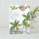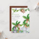 Sweet animal safari, childrens birthday party invitation, featuring a jungle safari theme, with palm trees, tropical flowers, a tortoise, a monkey, rhino, giraffe and parrot. The invitation has an easy to customise birthday party invitation template, the font styles, sizes and colours can be changed by clicking on the customise further link after personalising.