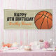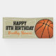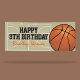Basketball themed happy birthday banner featuring a basketball court, a ball, and a childrens party banner template.