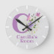Kids Bedroom Clock. Design features Monogram & Name with Flowers either side in a water colour pastel style. Example name is Camila. Change name as desired for anyone with a name beginning with C.