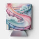 A dreamy watercolor painting of a curved waterslide rendered in soft pastel pink and powder blue hues that blend and flow together like cotton candy clouds. The slide winds gracefully through the composition with gentle curves and spirals, its translucent colors bleeding into each other with the characteristic wet-on-wet watercolor technique. Delicate splashes and droplets of water are suggested through lighter washes and negative space, creating a sense of movement and joy. The background fades into a pale, ethereal wash of complementary pastels, giving the entire scene a whimsical, childhood-memory quality with soft, diffused lighting.
