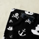 A kid’s pirate themed beach towel with a pattern of anchors, ships, and smiling skull and bones. The colour scheme is black and white. Simply customise the name, add this towel to your cart, and get out to the beach!