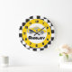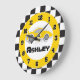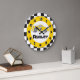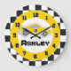Original graphic kids bedroom cars racing yellow wall clock for kids. Perfect for a yellow racing styled kids bedroom. Featuring a yellow sports car on graphic chequered flag stripes. Customise with the name and number or age of your choice. Currently reads Ashley 12. Graphic uniquely designed by Sarah Trett.