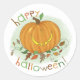 Kids of all ages will enjoy this whimsical illustration of a smiling Halloween pumpkin, which reads "Happy Halloween" in a child's font.