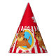 Set against a vertically striped red and white background is a cartoon tiger jumping through a red and white hoop that has a white, yellow and blue center all framed by vertical bright red and white stripes above which is the birthday boy or girls age. The hat resembles a circus / carnival tent.