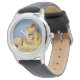 Kids classic black leather strap watch shown with a wildlife lion photo print. Choose this watch from several styles. Customise this watch or buy as is. Stock Image