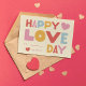 This modern kids' classroom Valentine's Day card features the words "Happy love day" in a large, bold, blocky font. It's in traditional Valentine's colors such as pink, red, yellow and light blue. Ideal for boys or girls to give to their friends and teachers.