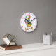 A circus clown wearing a yellow hat, polka dot pants and big shoes, is juggling red, yellow, blue, and green balls. The clock numbers and round thin border are red on a white background. Fun for kids or adults.