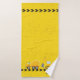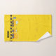 Cool custom construction vehicle bath towel set for a child who loves yellow construction vehicles in black and yellow. Fun vehicle bathroom decor for a little boy who loves cars and trucks. Customise with your kid's name under the black and yellow caution tape. Features a concrete mixer, dump truck, and a digger with a backhoe.