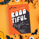 Kids Costume Halloween Party Invitation with cute illustration and ghostly typography. The orange, black and white make it perfect for a Halloween celebration, wishing you a boo-tiful night this Halloween celebrating with a costume party.