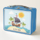 A metal lunch box for kids with a cute pirate ship design and personalized name. Ideal for school lunches, snacks, or picnics, combining fun and function in one container.