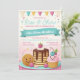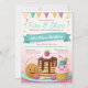 The invitation has a breakfast theme, illustrated by a happy pancake stack with a pat of butter and syrup on top, alongside a cheerful cupcake with a swirl of pink icing and a cherry. The colour scheme is soft and pastel, with shades of pink, blue, and yellow, and a background that features a light blue upper half with subtle polka dots and a pink lower half. Party elements like confetti and party hats are scattered about, suggesting a celebratory mood. The graphics are cartoonish and friendly, designed to appeal to a child-friendly event. The overall design conveys a sense of joy and morning festivity.