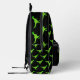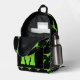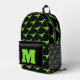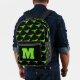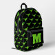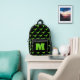 Kid's dinosaur backpack with custom monogram. Cool green dino pattern with black background. Background colour can be changed. Wild prehistoric animal print. Cool Birthday gift idea for boys. Personalised back to school supplies for children.