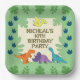 Cute dinosaur birthday party paper plates featuring yellow, blue, orange and purple dinosaurs on a green foliage background. These adorable plates also have templates so you can add your own details for your child's special day.