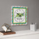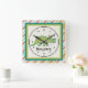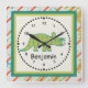 Personalise this ccolorful square wall clock featuring a cute tricerotops for a special child's room. Just edit his or her name in the easy Zazzle text editor with a simple step. Created in green, teal, orange and black colour accents.