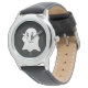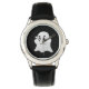 This kids watch is shown in stainless steel with a black face and black leather strap with a Halloween ghost print.
