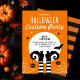 Cute Halloween costume party invitation with dangling spiders hanging from witches feet. The text is surrounded by stars, spiders and a bat. The back features matching stripes in black and orange.
