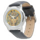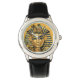 Kids King Tut Egyptian Black Leather Strap Watch shows beautiful photo of King Tuts Mummy Mask, watch is finished in stainless steel.