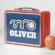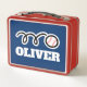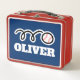Kid's lunch box with custom baseball sports print. Retro style metal lunch box with name of child. Personalised gift ideas for little boys going to kindergarten and preschool. Old school shiny metallic lunchbox with handle. Cute Birthday or Holiday gift idea for son, grandson, nephew etc. Add your own name, team, monogram initials or funny quote. Sporty ball cartoon drawing. Available in many colours. Add your own background colour too. Athletic typography.