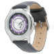 Personalise this kid's modern sporty watch with editable initials. Design is a circular text graphic in the centre in purple and black and white details. Just edit the letters in the easy Zazzle editor. Many other bezel and band style options available to select from to customise further to make it a gift for a kid.