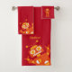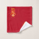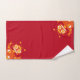 Kids Orange Red Robot Personalised Fun Bathroom Towel Set. Washcloth, hand towel, and body towel all have dark red backgrounds with bright orange crazy robots peaking out from the corners. Personalise with name on the body towel. Science fiction themed robot design for kids. www.SamAnnDesigns.com