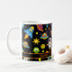 A colourful outer space mug for kids with astronauts, rockets, aliens, stars, ufos and planets all on a black milky-way photographic background. Ideal as a birthday gift for your grandson or other family member or friend. Add your own message at the bottom which currently reads - "happy 7th birthday Conor"