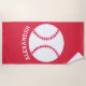 Kids Personalised Baseball Sports Red Beach Towel. Personalise with name in white font above a large white baseball with red stitching. Customise to change red background to another colour. Perfect for baseball or softball fans. www.SamAnnDesigns.com