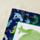 Kids Personalised Dinosaur Blue Watercolor T-Rex Beach Towel. Fun dinosaur pattern in watercolor blue and green on dark blue background. In centre is a larger green t-rex with name in blue. www.SamAnnDesigns.com