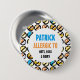 Personalised Multiple Food Allergies Kids Button. Pattern of food allergy symbols - no nuts, no peanuts, no gluten, no fish, no dairy and no eggs with black lines through on a white background. Centre has white circle with text to add name and allergens. Food allergy alert button can be attached to lunch boxes, book bags, medicine kits to alert to allergies or locate epinephrine. Designs by Lil Allergy Advocates www.lilallergyadvocates.com